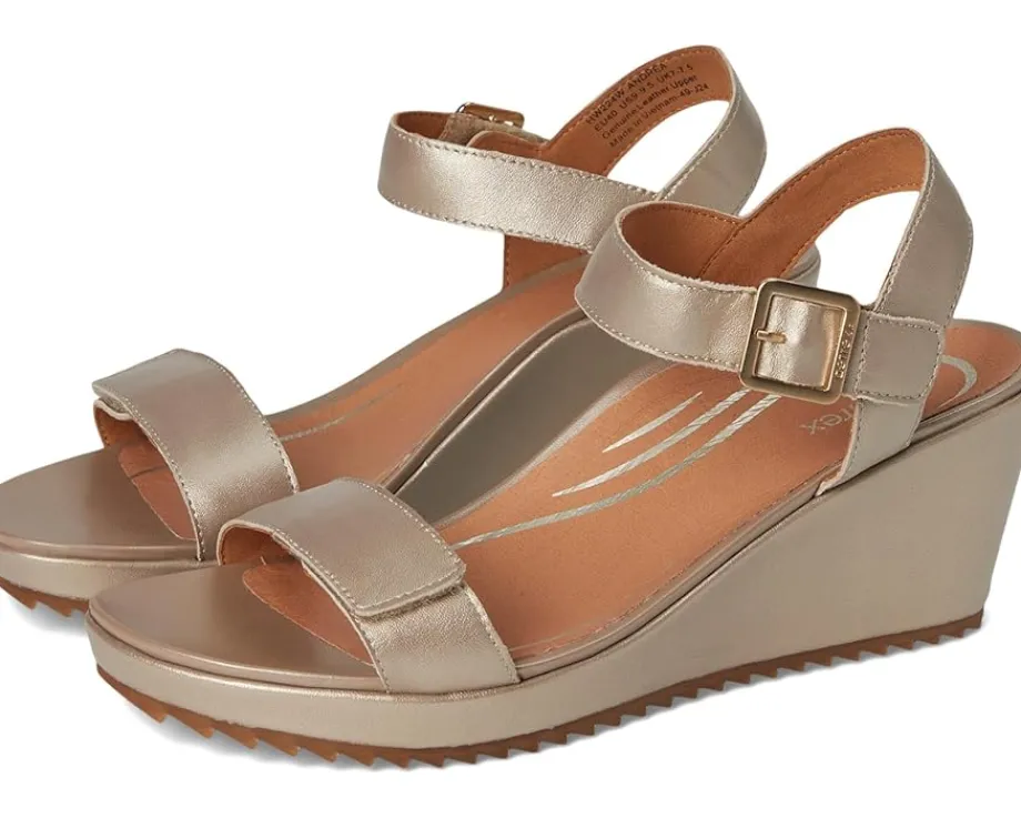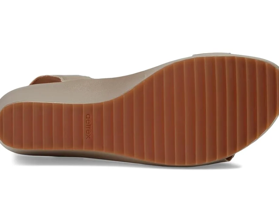 - Step into the season style with the Aetrex® Andrea Sandals, designed with adjustable quarter straps and hook-and-loop closures for a snug and customized fit. The leather-wrapped wedge heel and foam footbed offer a blend of elegance, durability, and comfort. These feature a leather upper and a faux suede lining. The Aetrex® Orthotic System is Built-In to every pair features arch support that helps to stabilize your body, align your feet and relieve common foot painFeaturing Aetrex Arch Support, the Andrea seamlessly combines practicality and fashion, perfect for any sunny-day outings.