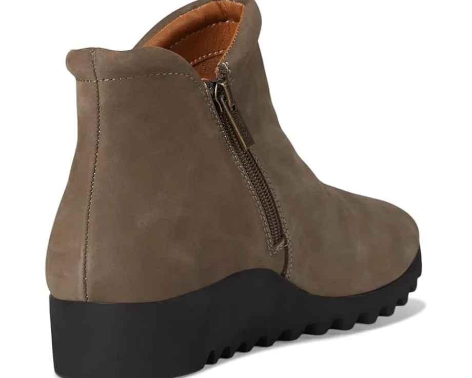 - Made for the Journey, Styled for the Spotlight, the Aetrex® Zoey is crafted from suede upper, polyester lining, and EVA insole. The Aetrex Orthotic System is built-In to every pair and features arch support that helps to stabilize your body, align your feet and relieve common foot pain. It comes with a closed round toe, mid-top silhouette, wedge heel, and zippered side closure.