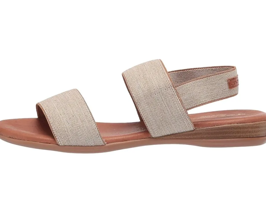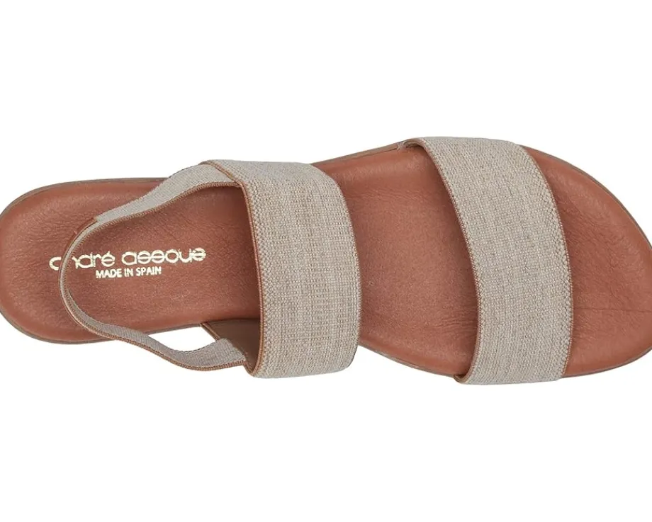 - The Andre Assous™ Nigella sandal exudes timeless style and comfort with an elastic upper, dual straps over the instep and vamp, and a mini stacked wedge heel.