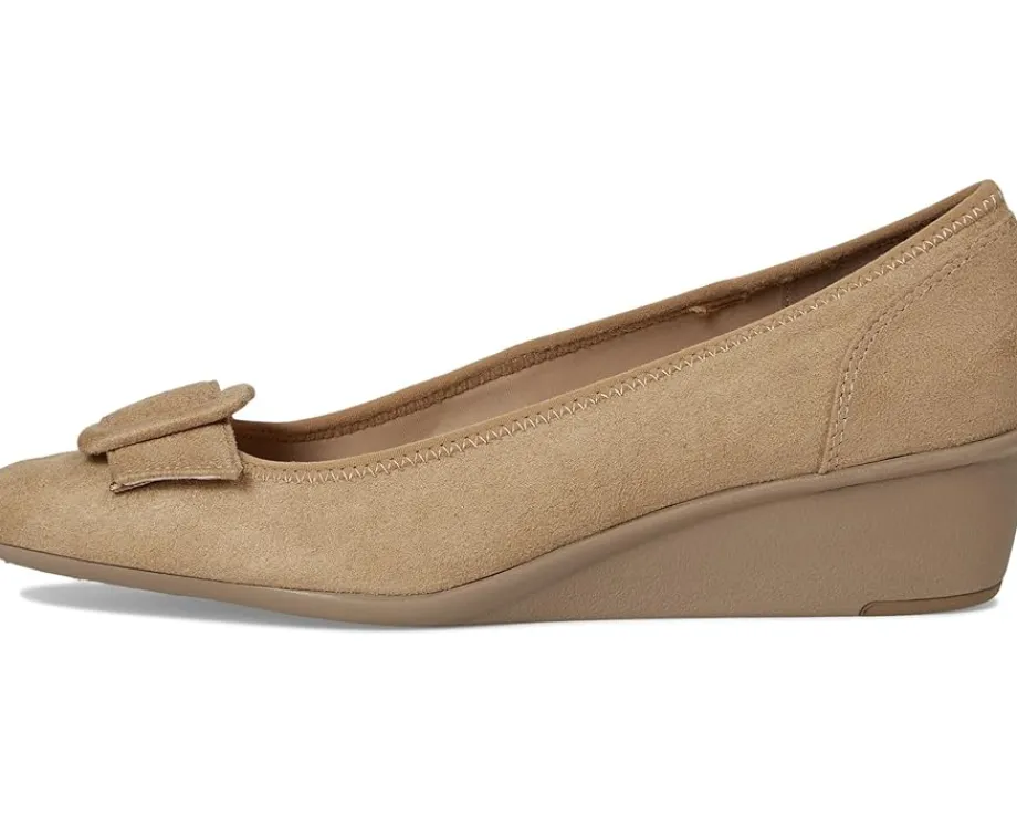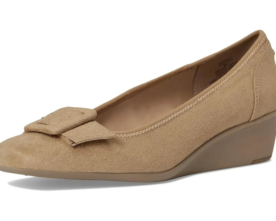- The Anne Klein® Wyatt is a refined staple that features a squared toe and a suede upper, elevated by a patent-texture heel counter. The padded polyurethane insole ensures all-day wearability, while the rubber traction outsole provides stability with every step. Set on a sleek wedge heel, this versatile pump transitions effortlessly from office to evening.