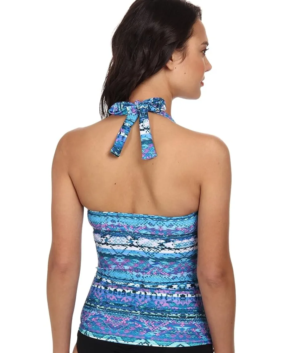 - Glamorous halter tankini flaunts a colorful tribal print throughout.