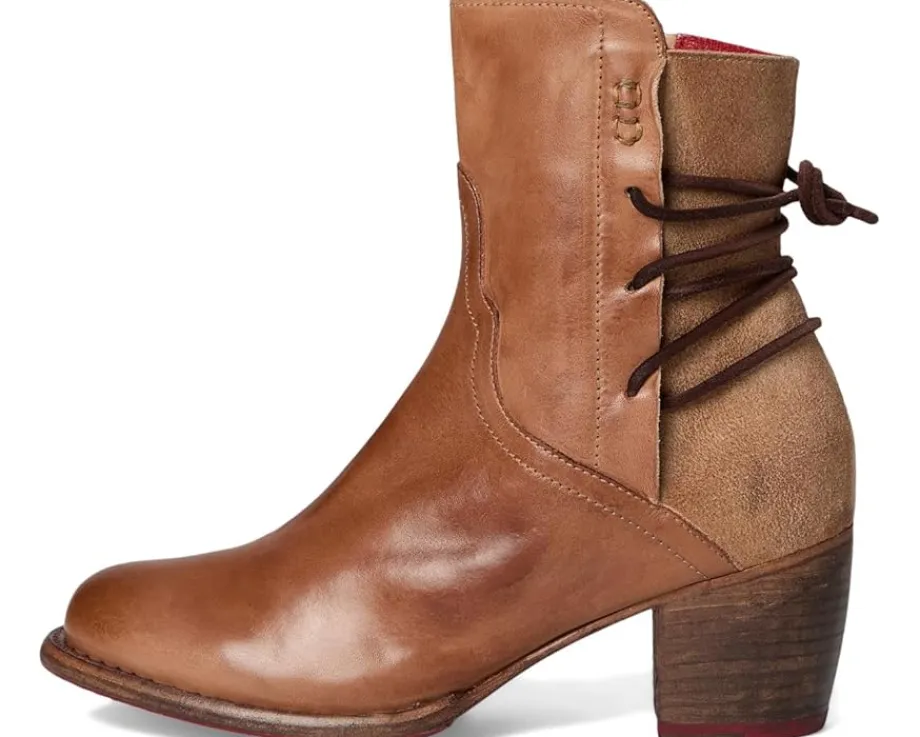- The Bed Stu® Cable mid-ankle lace-up boot blends rustic charm with modern edge. Crafted from vegetable-tanned leather upper, it features a Western-inspired almond toe, scalloped edge detailing, and a rear lace-up accent for added character. A functional side zipper ensures easy wear, while the stacked block heel and durable rubber outsole provide comfort and stability.