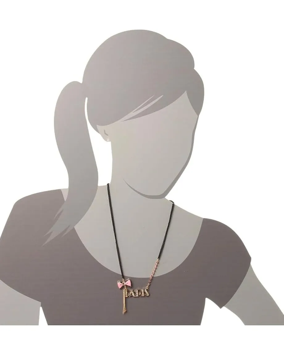 - Delicate black necklace features a gold-tone “PARIS” pendant with AB rhinestone accents.