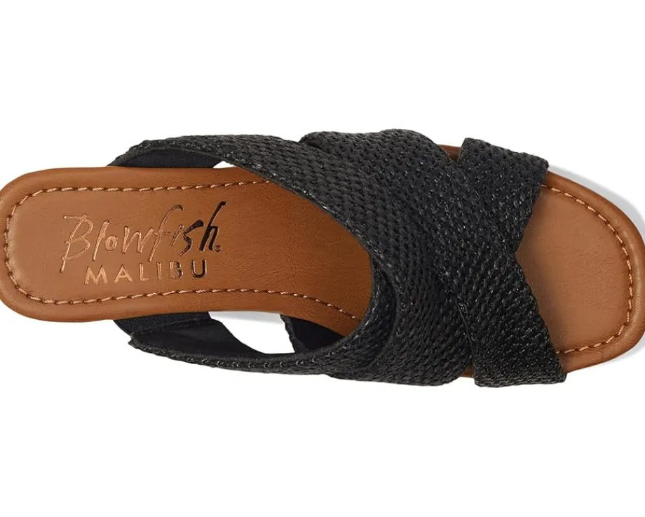 - Elevate your resort style choosing the Abi Wedge Sandal from Blowfish® Malibu. It features a woven faux-leather upper with crisscross straps and a platform wedge heel for a little extra height. The sandals have polyurethane lining, foam insole, and synthetic rubber outsole.