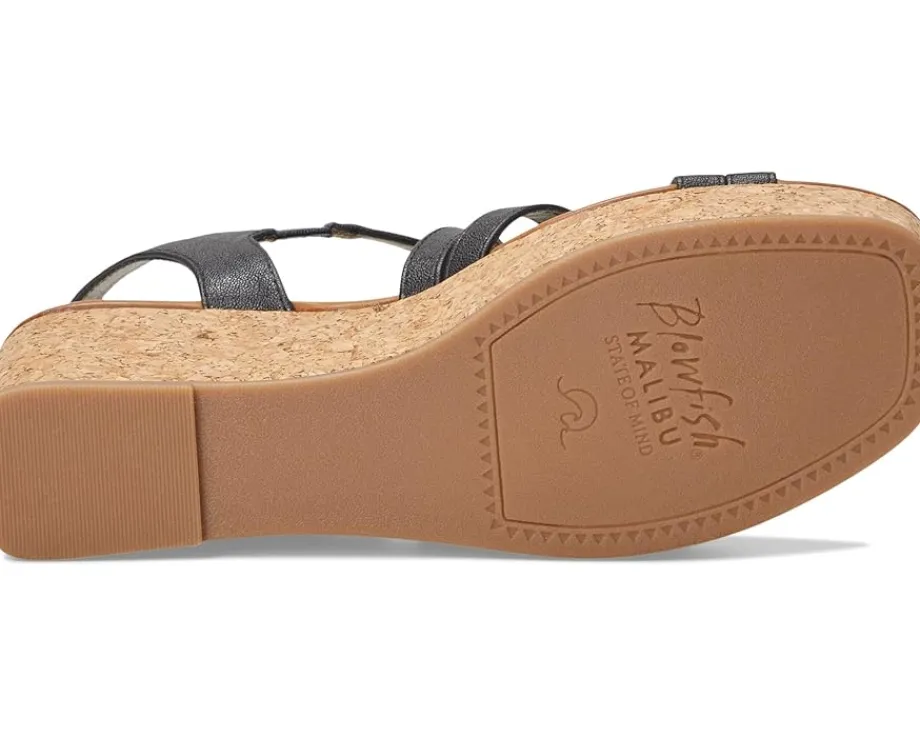 - Update your footwear collection by adding to it the stunning Blowfish® Malibu Aurora Heels. The strappy sandals feature a faux leather upper with a metal buckle closure, polyurethane lining, and a foam insole for lasting comfort. The cork wedge wrap heel adds to the style.