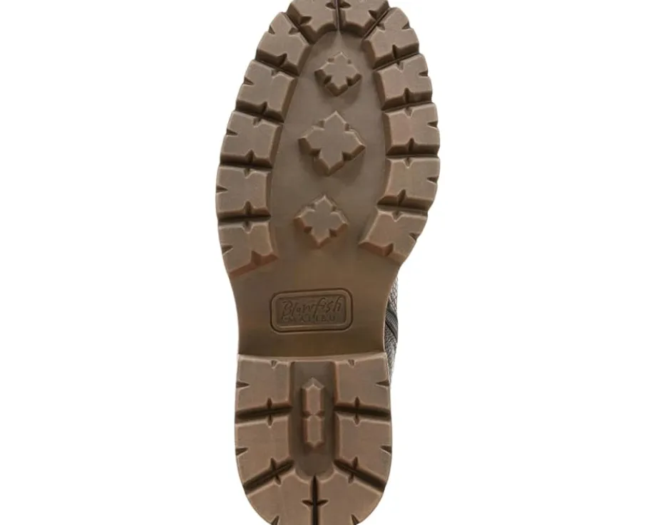 - The ankle-high Blowfish® Malibu Joy Booties feature a side stretch panel and inside zipper for easy entry. Designed with round toe shape and an aggressive lug sole, the boot stands on a stacked block heel. The faux leather upper construction accompanies a sleek hardware detail at the back.