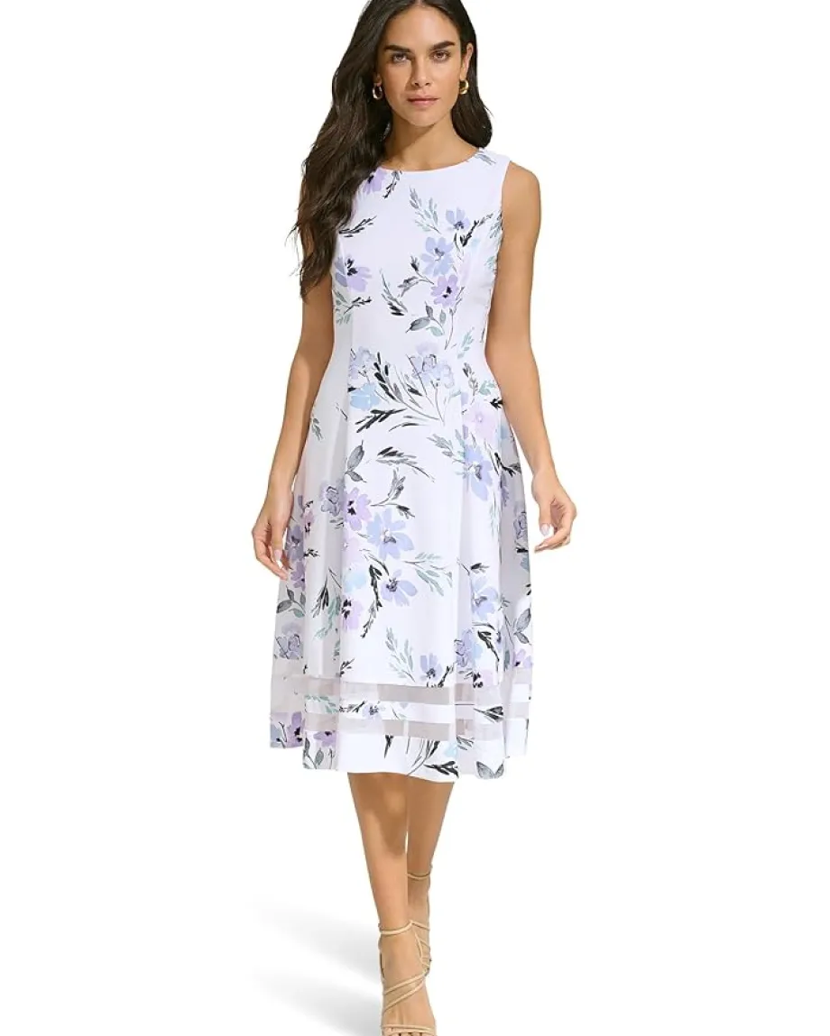 - Calvin Klein® A-Line Printed Scuba Dress with Illusion Hem Detail.