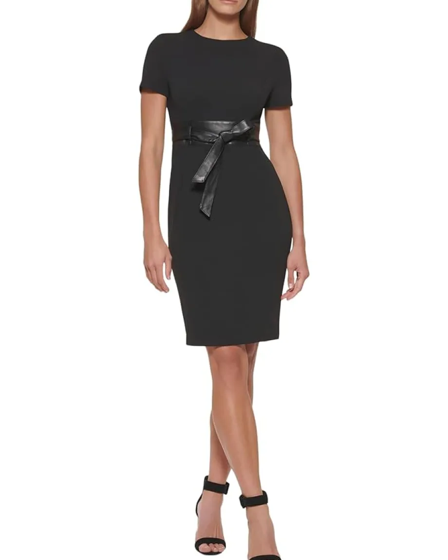 - Featuring a stylish belt tie closure on the front, the Calvin Klein® Scuba Crepe Short Sheath Dress with Faux Leather Belt curates your fashionable look in a unique way. This dress has a short-length silhouette which complements and hugs your body right. The soft fabric construction makes for the comfiest wear.