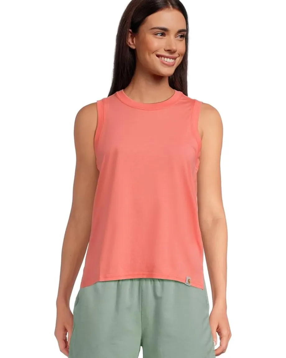 - Light, airy, and versatile, the Carhartt® TENCEL™ Fiber Series Relaxed Fit Tank is made from an extra-soft cotton-blend fabric that feels great on a hot day. A relaxed fit offers a little extra room to move. The pull-on style tank top features a ribbed crew neck, a sleeveless design, Carhartt® wrap label on wearers bottom-left, and a straight hem with side splits.