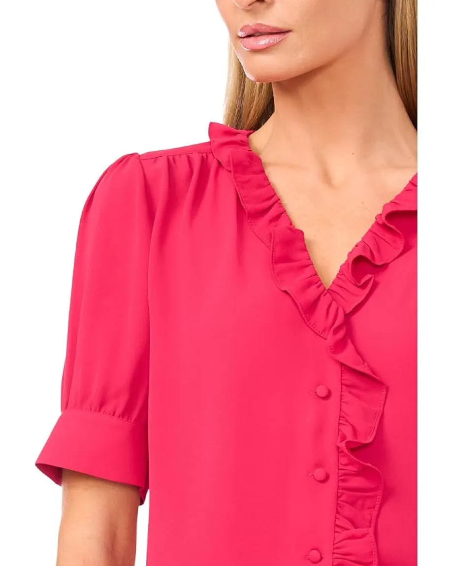 - Redefine your casual look wearing the CeCe™ Short Puff Sleeve Button Down Ruffled Top. This short puff sleeve button-up blouse is accented with delicate ruffle trim for a feminine look. The V-neck silhouette and soft detailing make it a charming choice for both workdays and weekends.