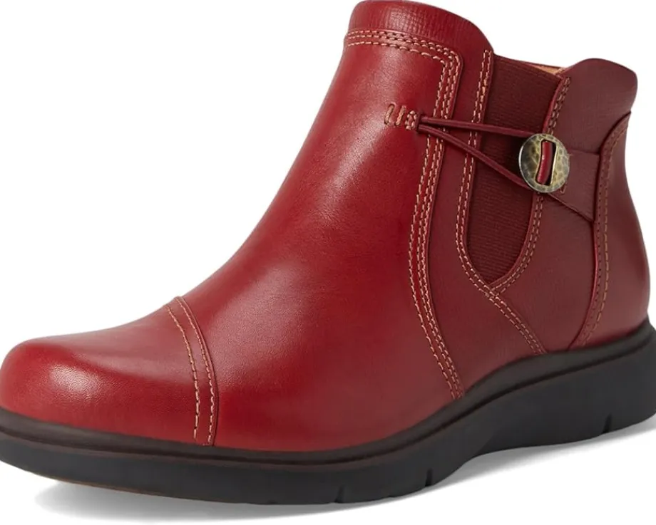 - An elasticized gore panel and side zipper for easy entry accentuate the Clarks® Certina Joy Ankle Boot. Featuring a roomy round toe shape, the footwear has leather upper, lining, and suede insole.