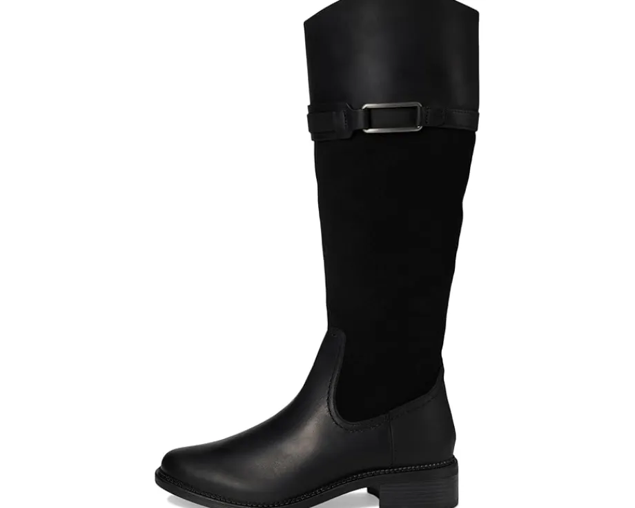 - Add an eye-catching appeal to your outfits with the Clarks™ Maye Carly boots. The polyester insole and mesh lining of these boots keep your feet cool and comfortable. These knee-high boots are made of a leather upper that features a zippered side closure and a buckle detail. Stylish and durable, these hiking boots make a great addition to your footwear collection.