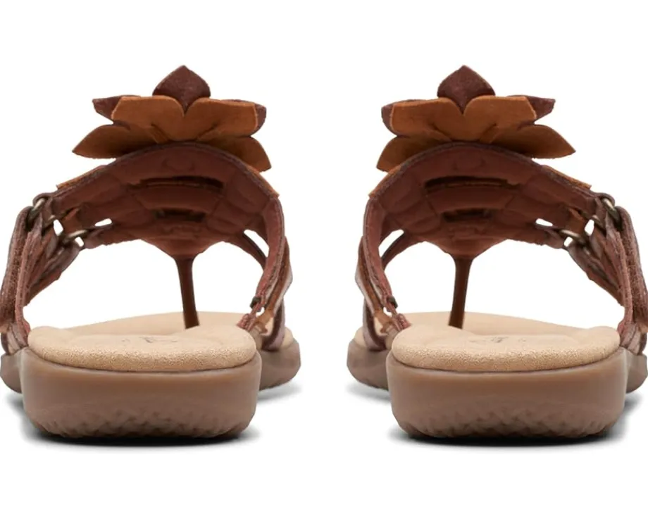 - Crafted with a leather upper with cut-out flower detailing, the Clarks™ Elizabelle Mae sandals offer a chic look. Offering superior comfort and style, the padded rubber footbed and mesh lining take your comfort to the next level. Easy to slip on and off, these toe-post style sandals feature a hook-and-loop strap closure that offers a custom fit. Flaunt your great style by wearing these stylish sandals.