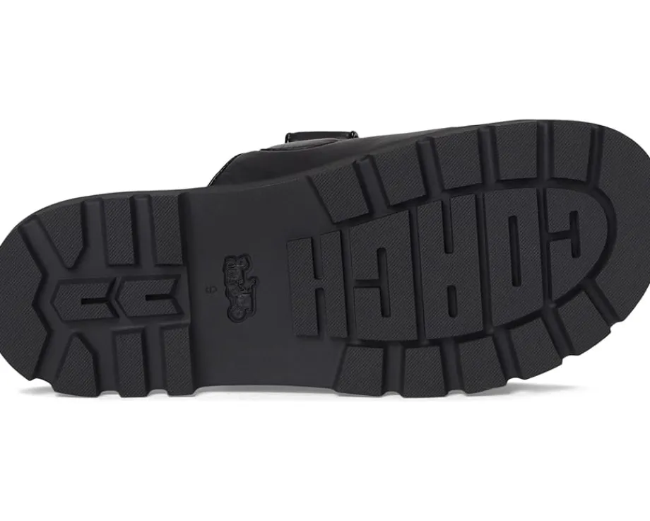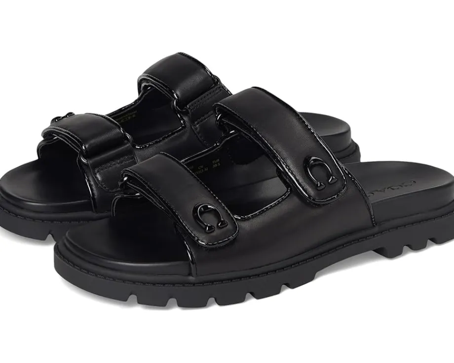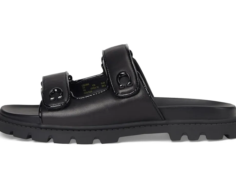 - Whether it’s brunch, beach, or busy streets, these COACH® Sculpted C Leather Double Band Sandals keep you grounded in comfort and grace. Crafted from leather upper, man-made leather lining and footbed, this pair of slip-on sandals features open round toe, two strap detailing with brand logo, and brand detailing on the footbed.