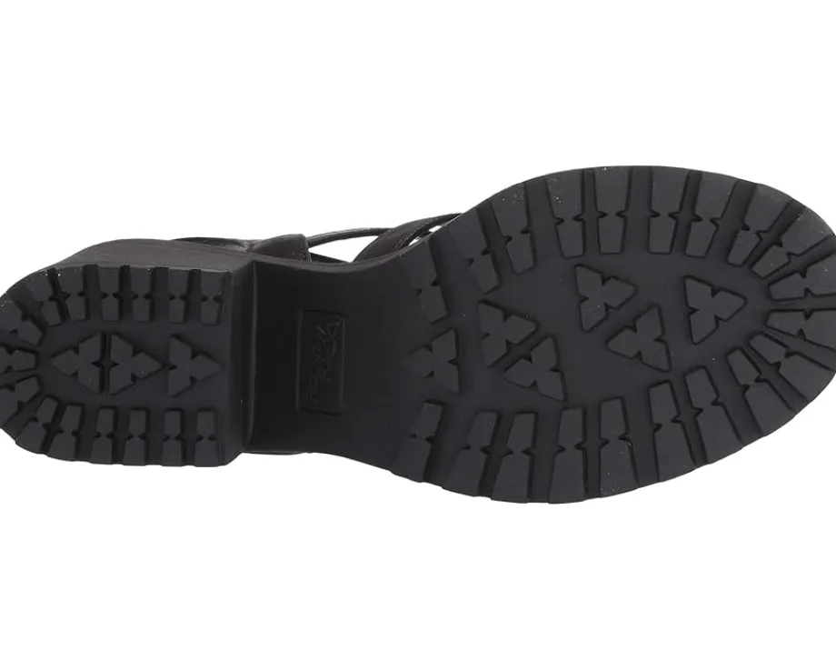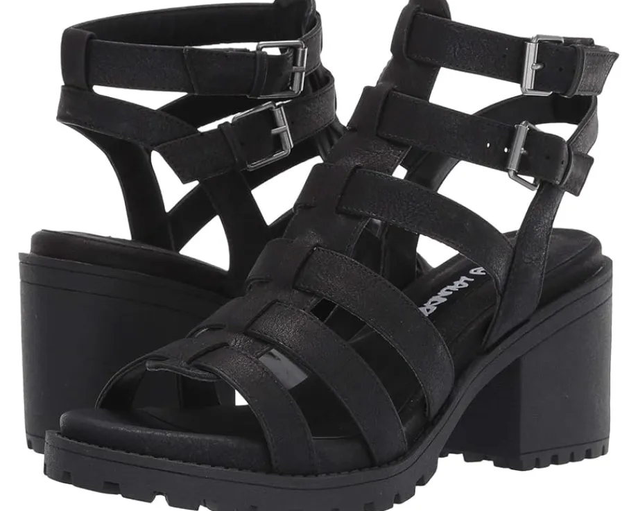 - Ankle straps with buckle closures.