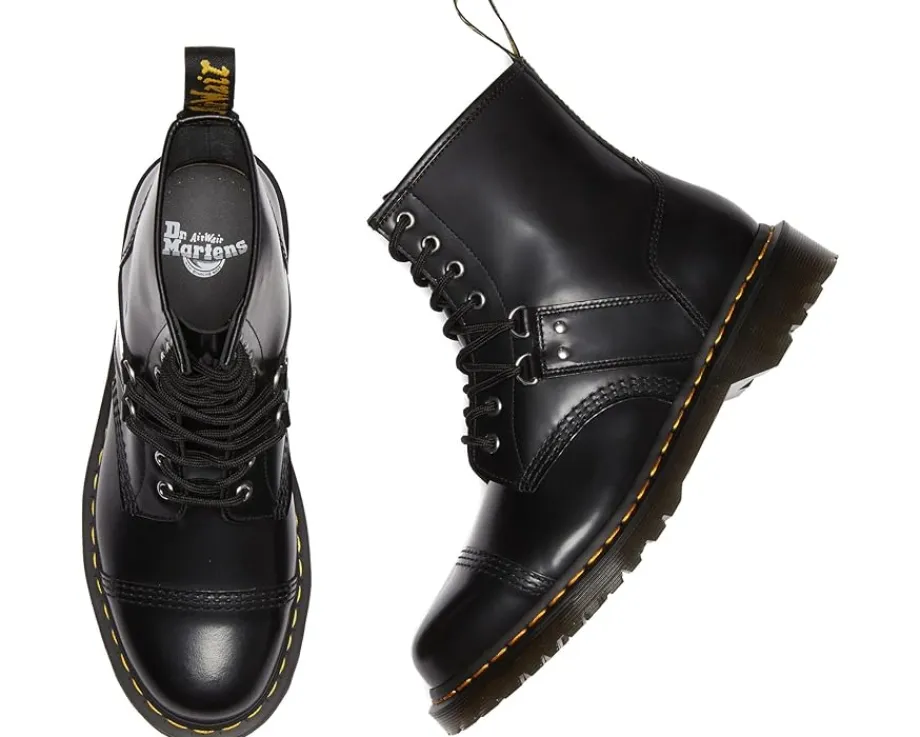 - Styled with an angular shape and a high-shine finish, the Dr. Martens® 1460 Hardware boots add a bold, futuristic look to your outfits. The mid-top leather upper of these boots features a traditional 8-eyelet lace-up closure that offers a perfect fit. These work boots are designed with Goodyear welt stitching which makes them a durable choice. The EVA foam footbed provides all-day comfort. Make your fashion statement wearing these leather boots.