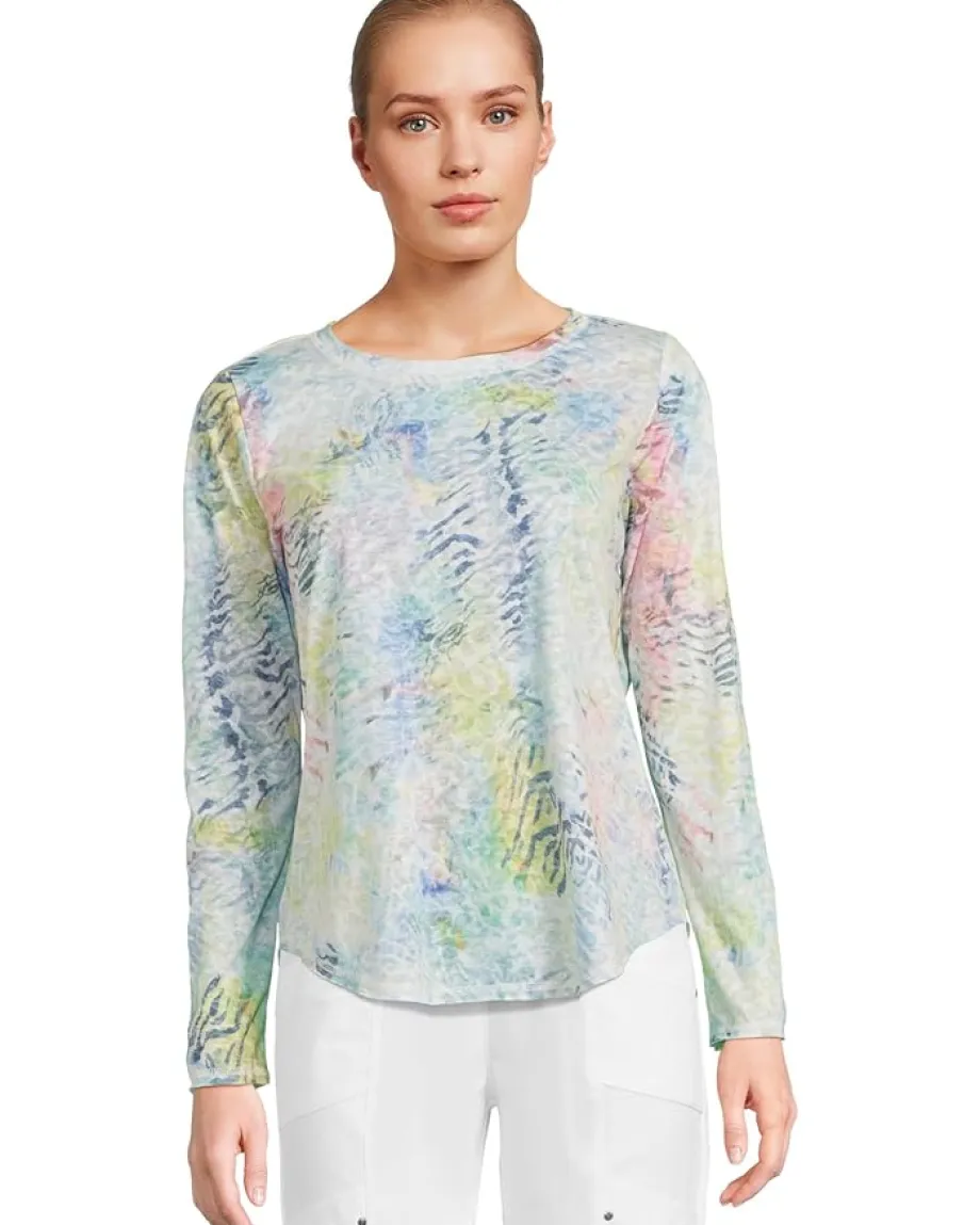 - The Elliott Lauren™ Ambrosia Top brings a touch of artistic flair to your everyday wardrobe. Featuring a dreamy abstract graffiti print, this relaxed-fit style is designed for comfort with just the right amount of edge. It’s finished with a classic crew neck, long sleeves, and a curved hem with raw edges for a laid-back vibe. Top stitch detailing adds subtle texture, making this an effortless piece to pair with your favorite denim or casual trousers.