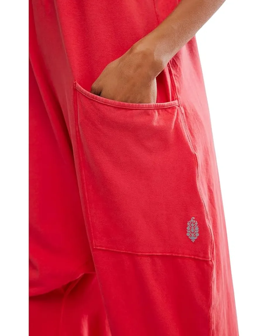 - Embrace your free spirit with the FP Movementâ„¢ Hot Shot Onesie! This trendy piece features a sleeveless, round neck, racerback silhouette, oversized front patch pockets, dropped armholes, and a back pocket with zippered detail. Soft and comfy, its slouchy, relaxed fit and dropped crotch design provide ultimate comfort, while convenient side pockets keep essentials close.