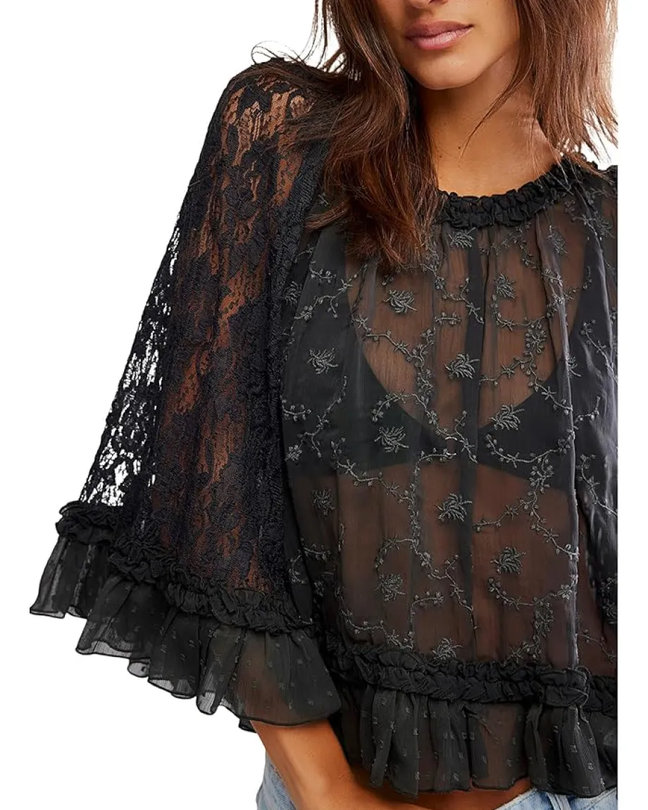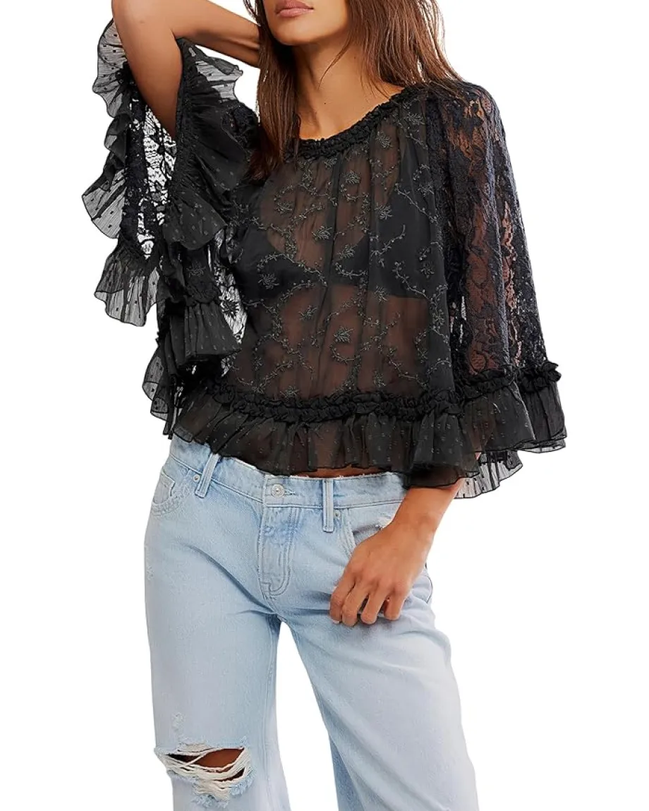 - Float into fashion donning the Free People™ Carly Cape Top. Darling as ever, this all-lace stunner redefines romantic charm with its breezy cape silhouette that turns every twirl into a moment. Crafted from delicate lace for that ethereal, feminine feel, it features a flattering, flowy fit that drapes effortlessly over the body. The crew neckline adds a touch of classic simplicity, while the ruffle trim brings the perfect amount of playful detail.