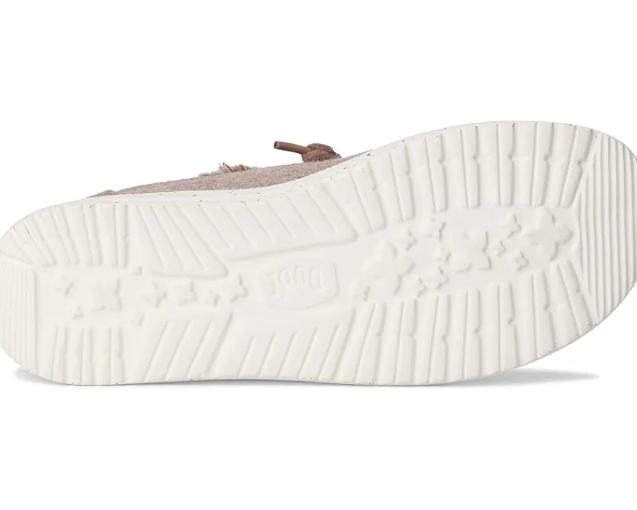 - The Hey Dude® Wendy Wool Cozy shoes are slip-on sneakers that are ready to roam. Their easy-on elastic laces offer a secure fit, while the polyester upper features a Flex & Fold design that supports healthy feet with their unique shape, giving complete freedom of movement. They are made of an EVA insole and a polyester lining.