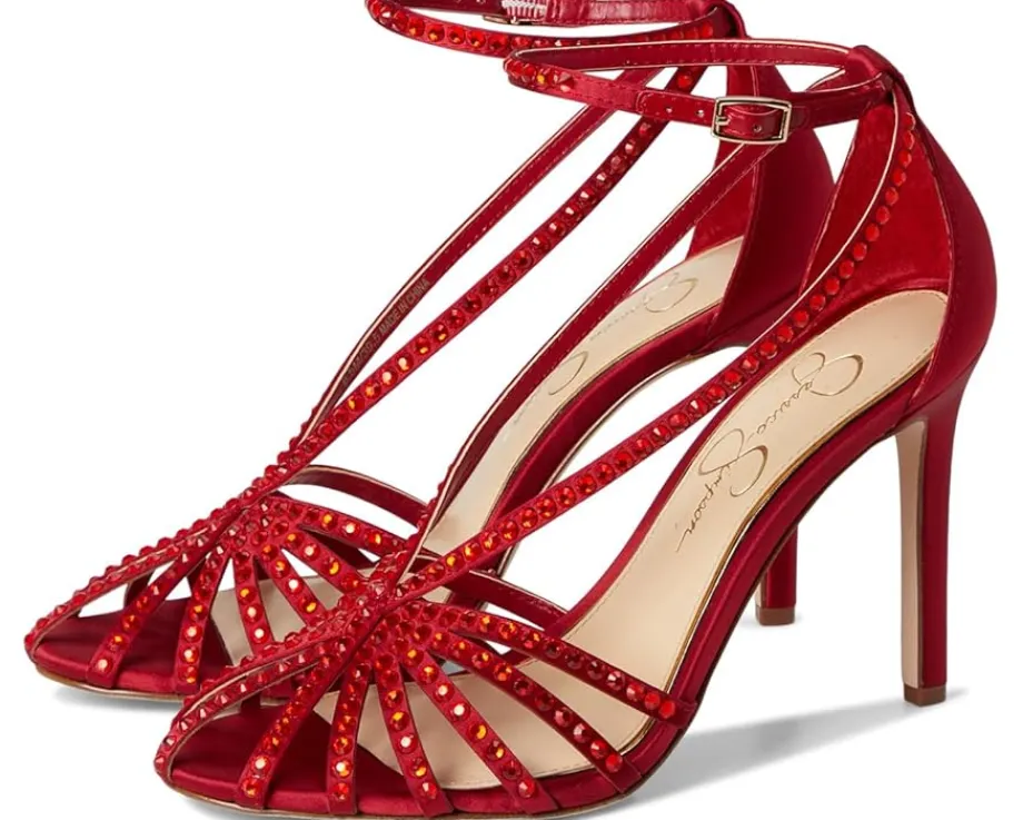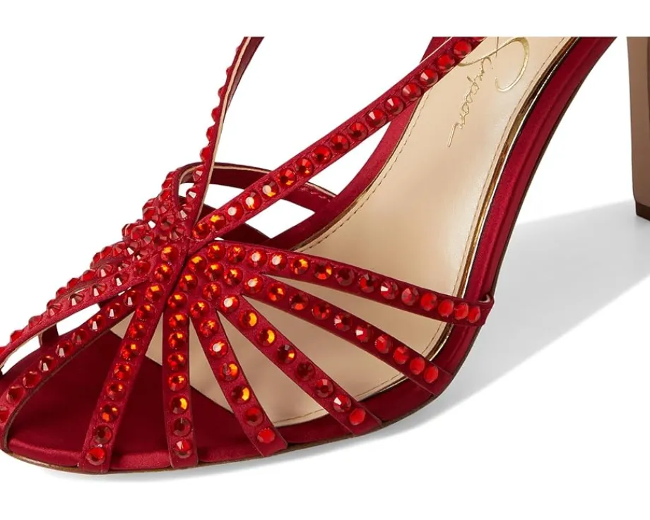 - Dazzle all night, adorning Jessica Simpson™ Jittale Embellished High Heel Sandals. Featuring a glitzy caged design adorned with shimmering rhinestones, these evening-ready heels elevate your look from elegant to unforgettable. The slender stiletto heel brings height and confidence, while the secure buckle strap closure keeps you poised and polished through dinner, dancing, and everything in between. Crafted with a soft polyester upper and lining for all-night wearability, and grounded with a durable rubber insole and outsole for reliable traction, these sandals strike the perfect balance of dazzle and function.