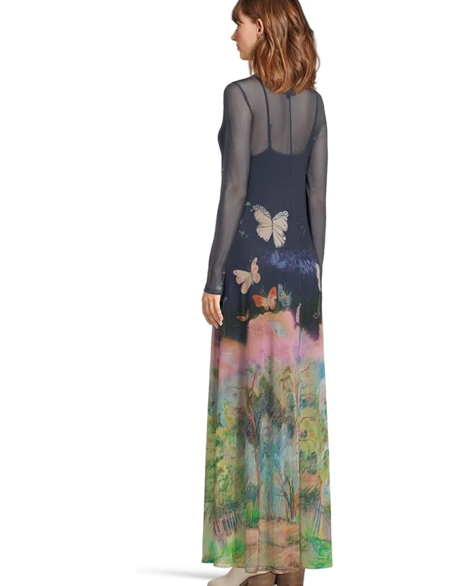 - A sheer, butterfly-kissed maxi dress that’s equal parts dreamy and enchanting. Featuring a crew neckline with long sleeves, straight hem and a pull-on style.