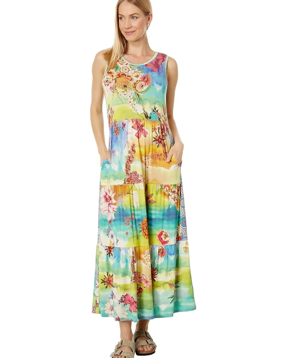 - A dress with pockets! The Johnny Was® Tie-Dye Sleeveless Tiered Dress features a tiered design on the skirt offering a vintage-appeal.