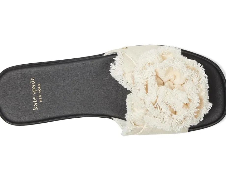 - Let your look blossom in effortless style wearing the Flourish Canvas Flat Sandal from Kate Spade New York®. Designed with a bold rosette accent featuring frayed edges, these slides bring a playful, feminine touch to your warm-weather wardrobe. The open square toe adds a modern edge, while the easy slip-on design ensures all-day comfort.