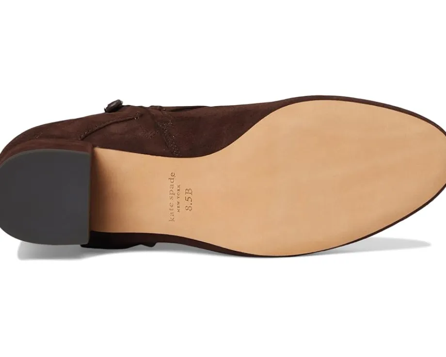 - The art of chic: The Kate Spade New York® Spade Flower Suede Ankle Bootie blends timeless elegance with a playful, modern twist. Crafted with a luxuriously soft suede upper, this mid-top bootie is designed to elevate any outfit, from casual denim days to polished evening looks. The signature Spade Flower detail adds a playful yet refined touch, while the block heel delivers both height and stability for all-day comfort. A smooth cotton lining and premium leather insole ensure a breathable, cushioned feel, while the durable leather outsole offers lasting wear. The sleek zippered side closure makes slipping in and out effortless, giving you style and convenience in one perfect package.