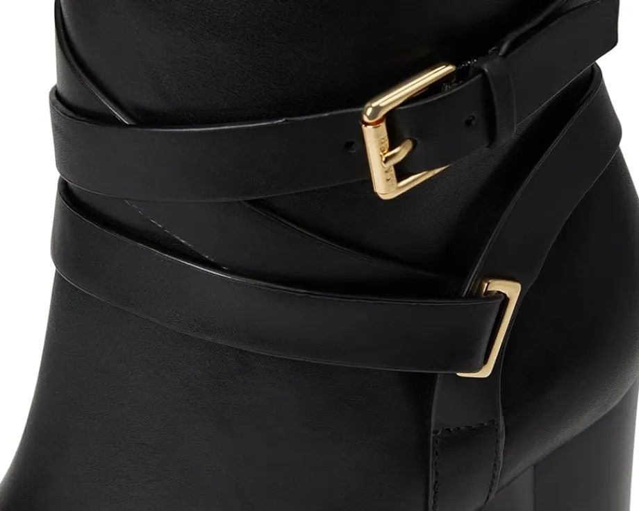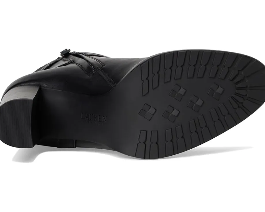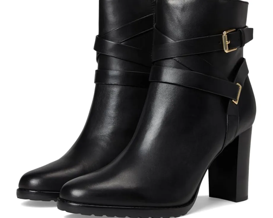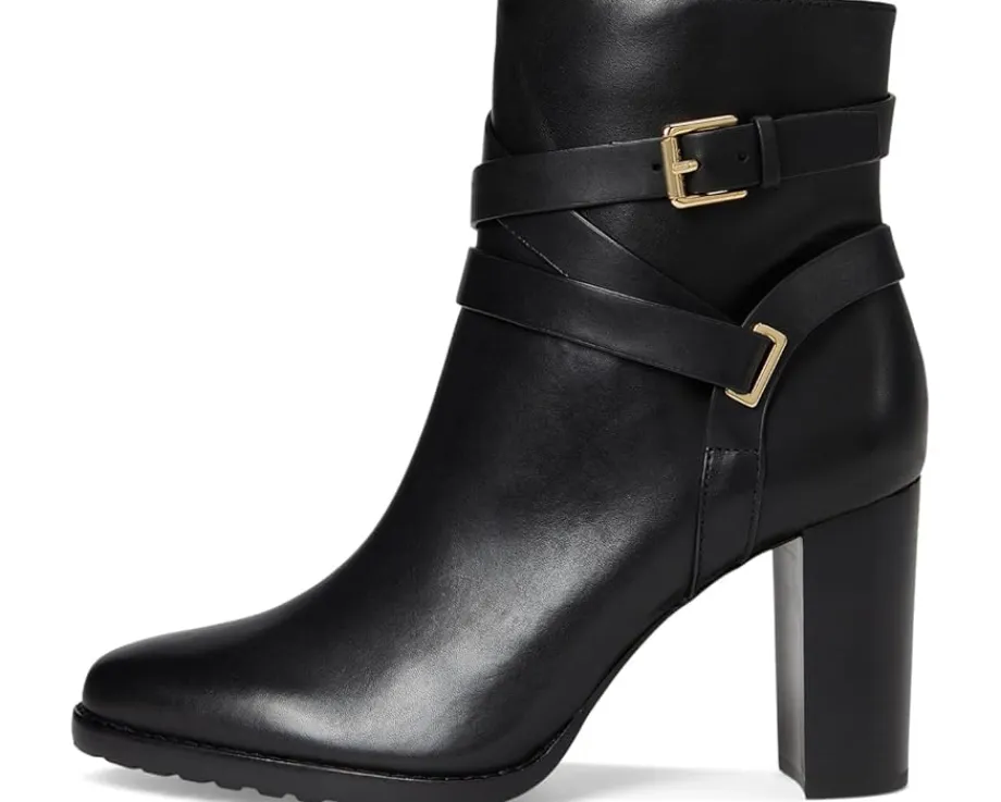 - Crafted with sumptuous burnished leather, the Lauren Ralph Lauren® Collins Burnished Leather Bootie Heel is elevated by an equestrian-inspired, wraparound crisscross ankle strap. A stacked leather heel affords added sophistication while doubling as a practical design element that ensures all-day comfort. The almond-toe boots are crafted with a leather upper, leather, cotton, & polyurethane lining, and a memory foam padded insole.