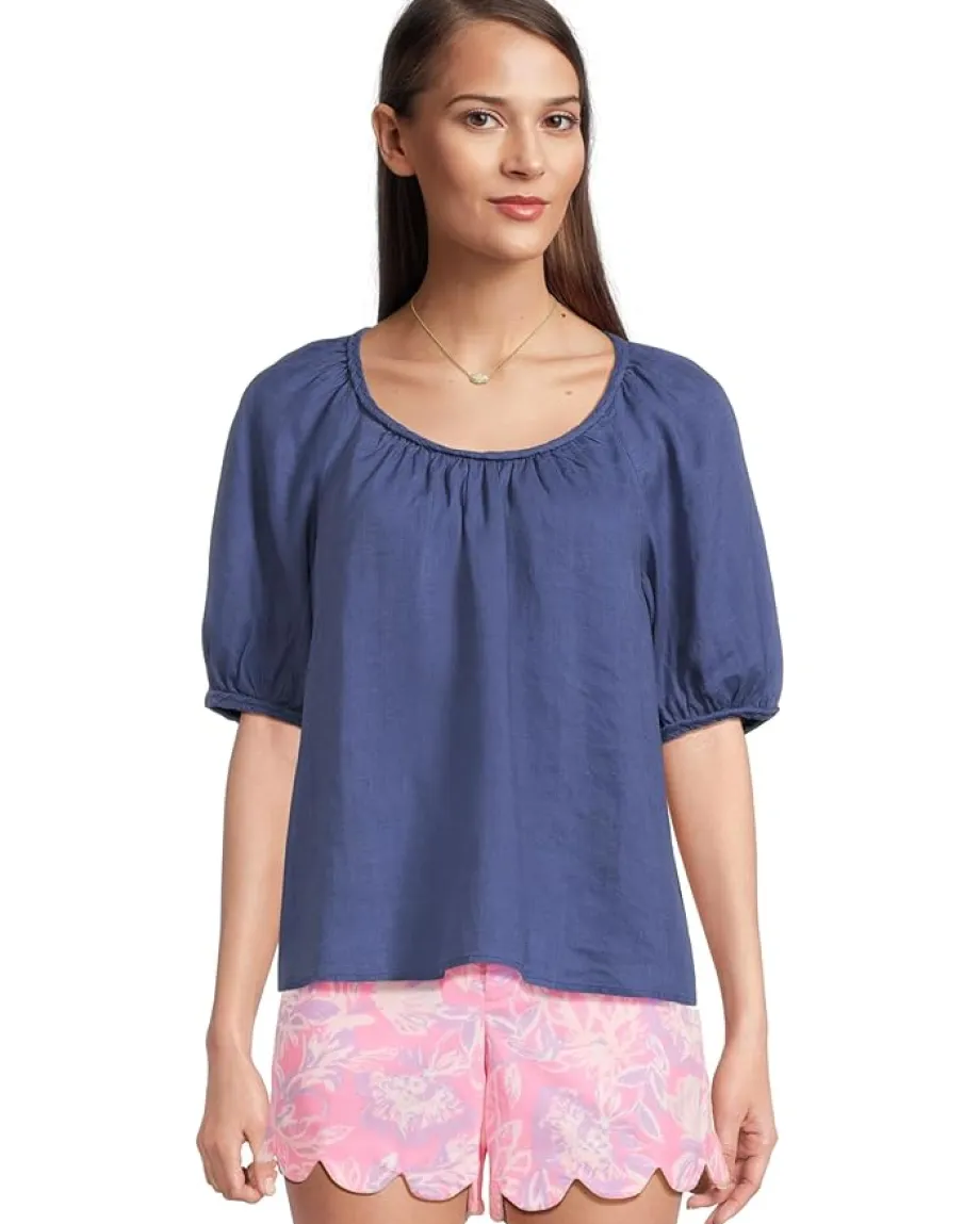 - The Lilly Pulitzer® Calais Short Sleeve Top is a breezy, easy fit blouse crafted from linen for lightweight comfort. It features a round neckline with braid detailing and short puffy sleeves, creating a relaxed silhouette that skims the body without clinging.