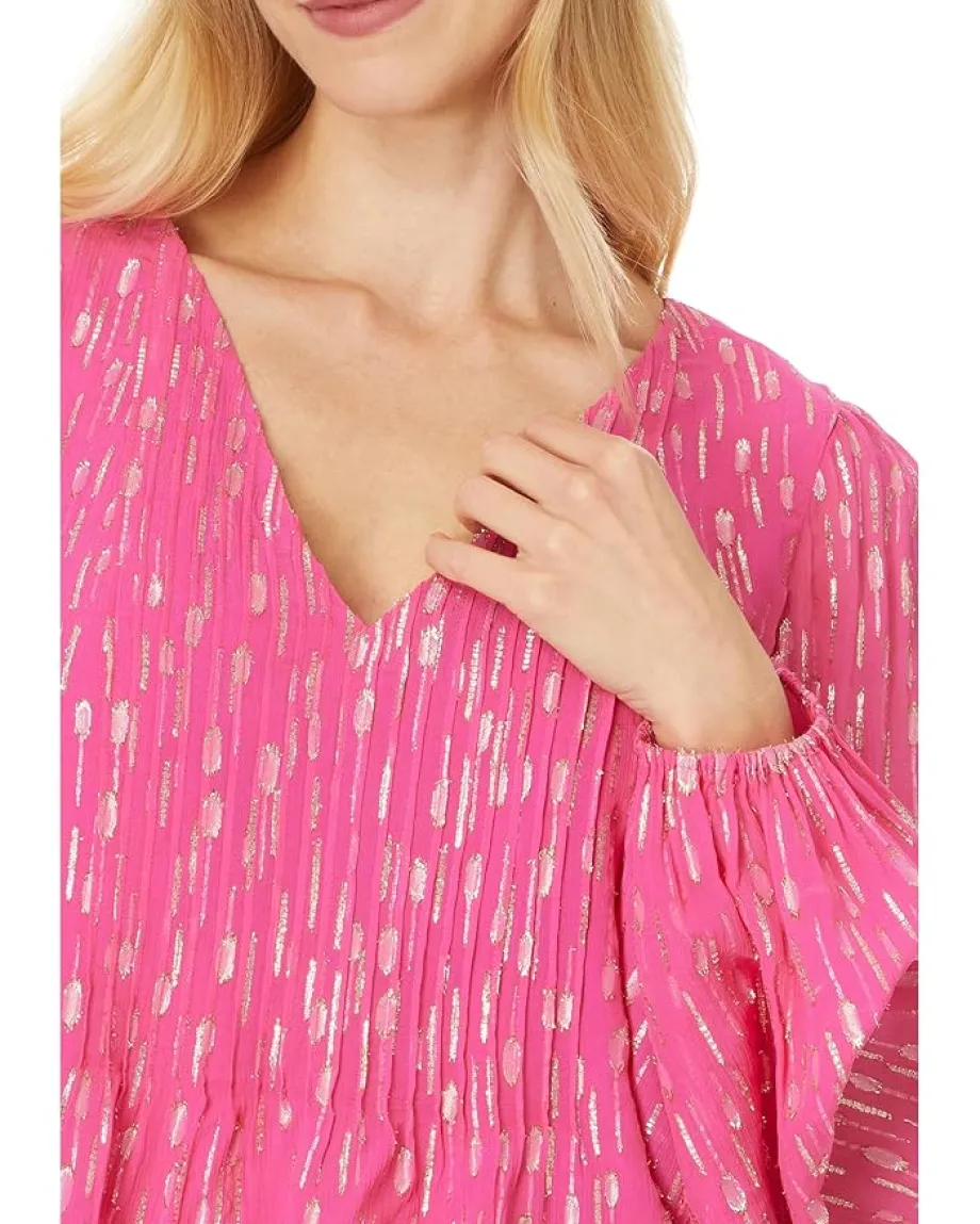 - Transition seamlessly from work hours to happy hours wearing the Lilly Pulitzer® Cleme Long Sleeve Top, that keeps its form. This easy-fit V-neck top boasts long, full sleeves adorned with whimsical ruffle details, while pintucks at the front neckline add a touch of refinement.
