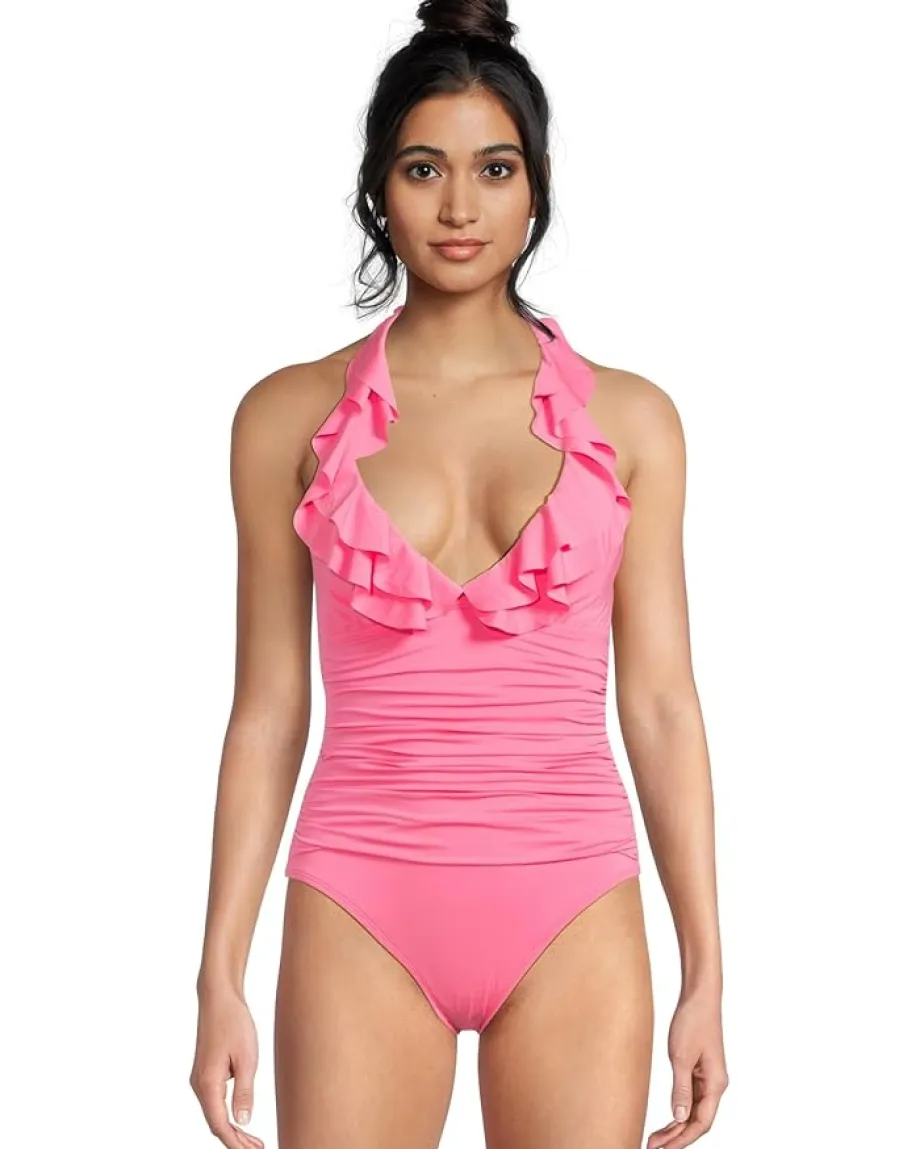 - Make a statement at the beach in the Lilly Pulitzer® Desmond One-Piece swimsuit. Featuring a ruffle V-neckline with an adjustable halter strap, shirring at the waist and moderate bottom coverage.