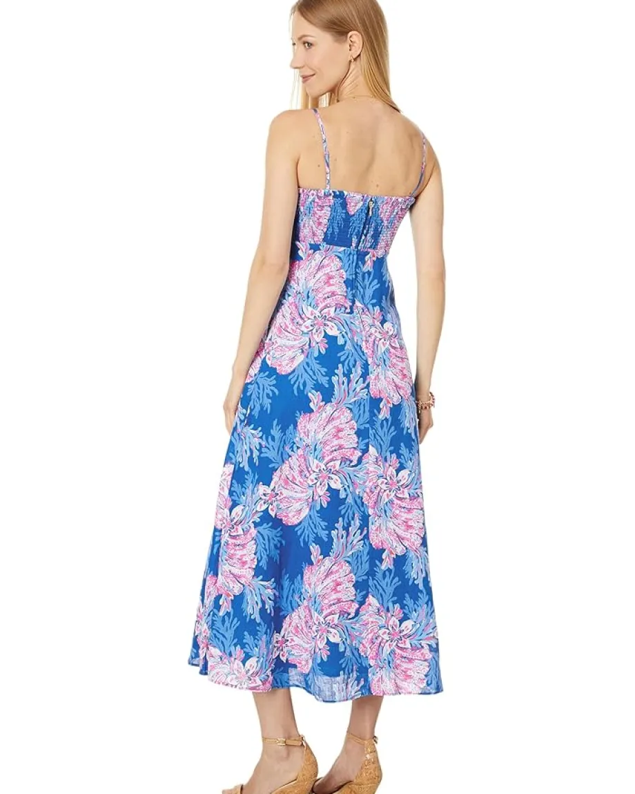 - The Lilly Pulitzer® Jorgian Linen Midi Dress is the epitome of warm-weather style. With its fit-and-flare silhouette and empire bodice with cups, this dress is sure to flatter any figure. The detachable spaghetti straps give you the option to wear it strapless or with straps for a customizable look. The smocked back panel adds a touch of detail, making this dress perfect for any casual occasion.