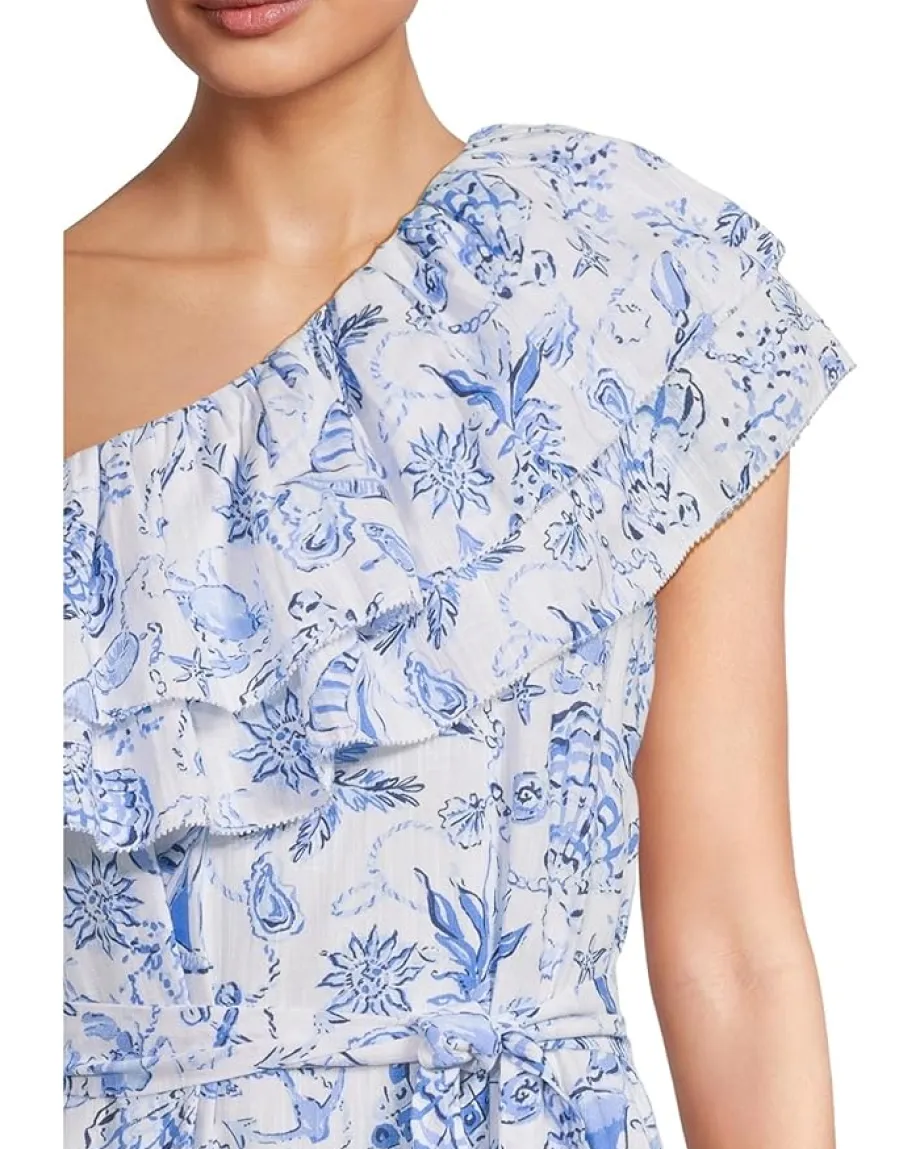 - Turn heads from sunrise brunches to sunset strolls in the effortlessly chic Lilly Pulitzer® Montecito Skirted Romper. Designed with a one-shoulder neckline and playful double ruffle detailing, this easy-fit piece merges the charm of a dress with the freedom of a romper. The tiered skirt adds flow and flair, while the separate sash cinches your waist just right for a flattering silhouette that skims the body but leaves room to move. The ankle-length hem and sleeveless design bring breezy elegance, and the blooming floral print ensures you’re always in full style bloom.