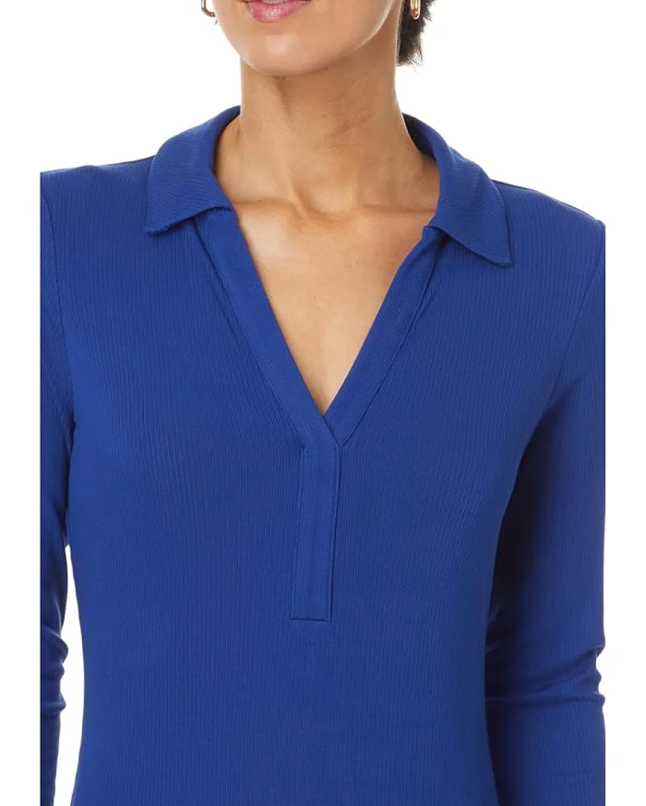- make your fashion choice as unique as you are by wearing Lilly Pulitzer® Ollie 3/4 Sleeve Maxi Polo dress. The dress features a spread collar with a split neckline and placket. The quarter sleeves hit below the elbow. An A-line midi is slit from the sides. It has a ribbed design allover with a straight fit that flaunts your curves. Intended to hit at the ankle.