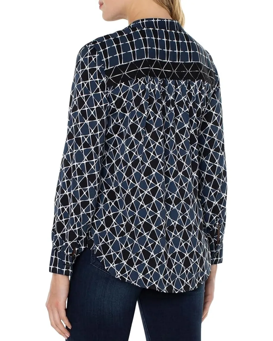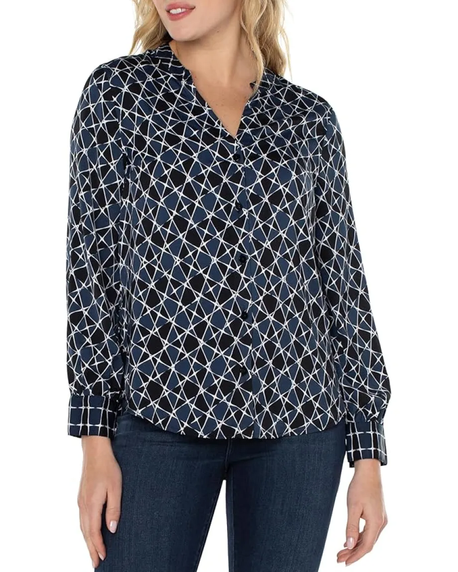 - Style your everyday look in the casual and vibrant Liverpoolâ„¢ Button Front Shirt with Banded Collar shirt, offering a comfortable year-round look. Designed with premium lightweight poly-sateen fabric in stargazing twin print. This button-up shirt features a banded collar and long sleeves with buttoned cuffs.