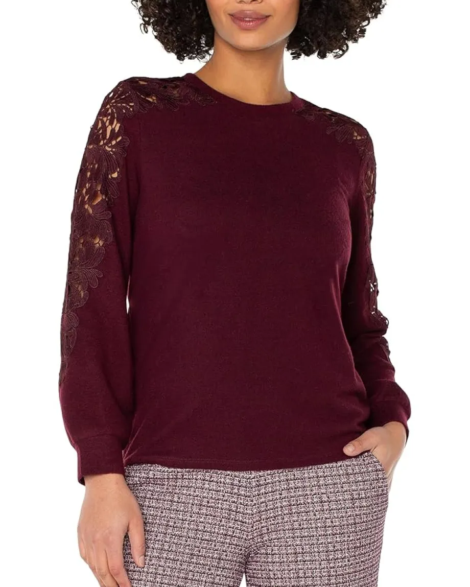 - Redefine elegance wearing the Liverpoolâ„¢ Los Angeles Long Sleeve Crew Neck Lace Inset Knit Top. This pull-on style top blends comfort and a femininity with lace on the long sleeves that adds charm to any outfit. Soft and easy to wear, it’s a versatile staple that moves seamlessly between seasons – and looks good in every color.