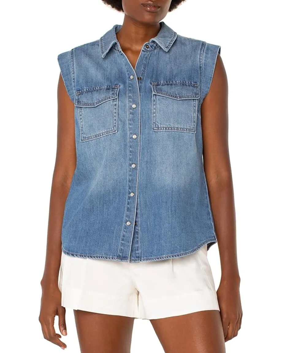 - Give your fashion game a chic update wearing the Liverpoolâ„¢ Los Angeles Sleeveless Shirt With Pockets. It is designed with pearlescent buttons that add a touch of elegance. The chest patch pockets not only enhance its functionality but also contribute to its laid-back charm.