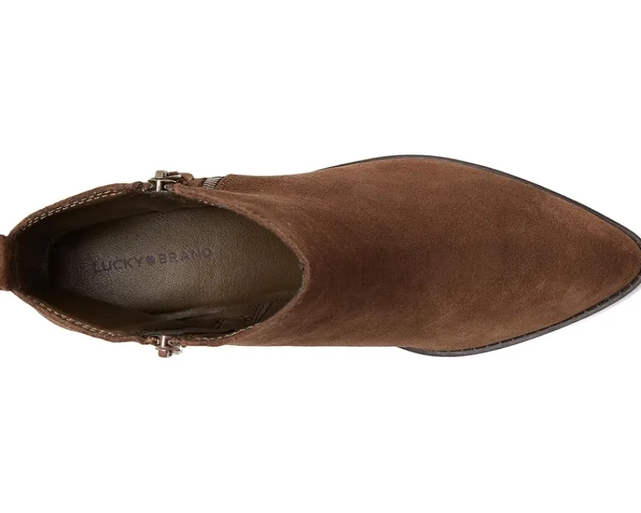 - The Ailein boot from Lucky Brand® is an effortless option for any fall look. This bootie features a pointed toe design, a stack heel, and a zippered side closure. Designed with a sleek leather upper and polyurethane lining, this bootie blends comfort and style with ease.