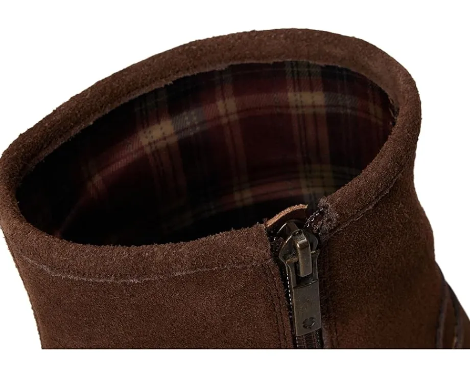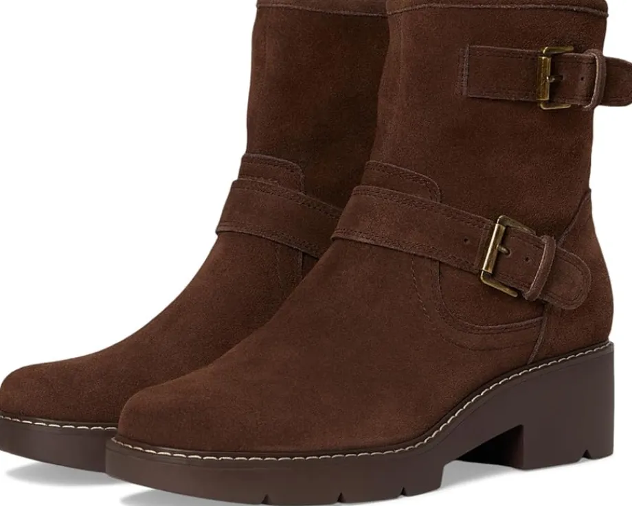 - A moto boot classic look in leather! The Lucky Brand® Migyn Double Buckle Moto Boots feature a double buckle detail, rubber outsole, leather upper, chunky block heel and zippered side closure.