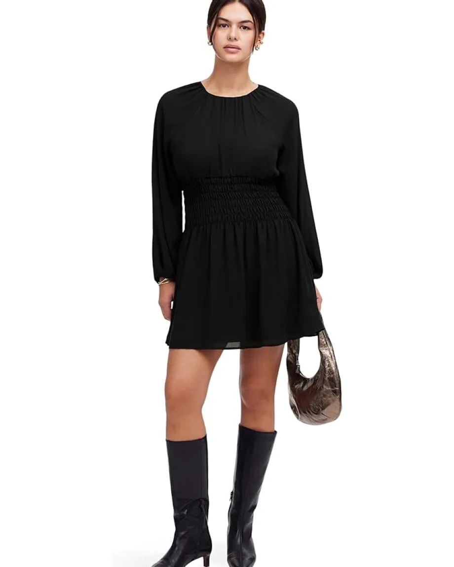 - This chiffon mini dress features long bubble sleeves and a smocked waist for a flattering fit. Its jewel neckline and fuller skirt add a touch of elegance, making it a versatile piece for any occasion.