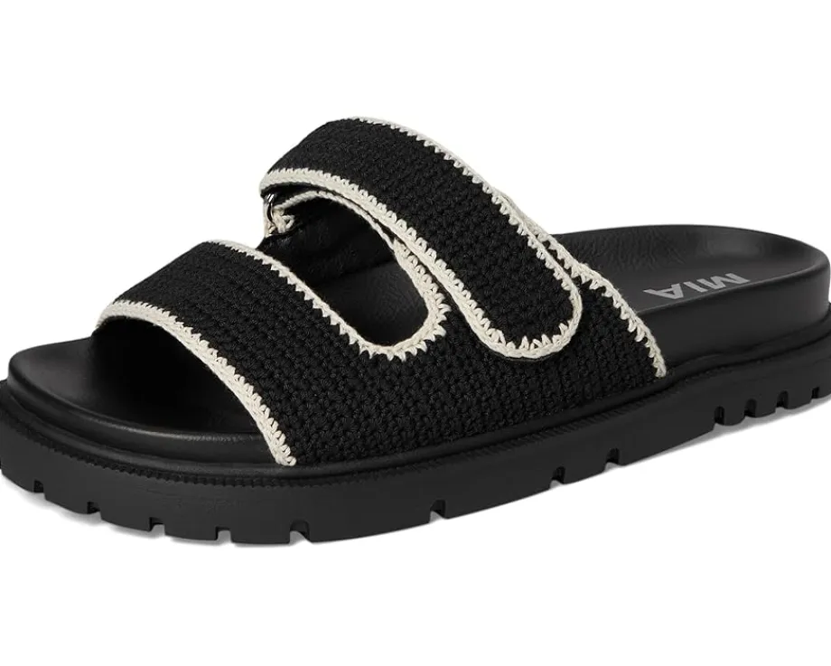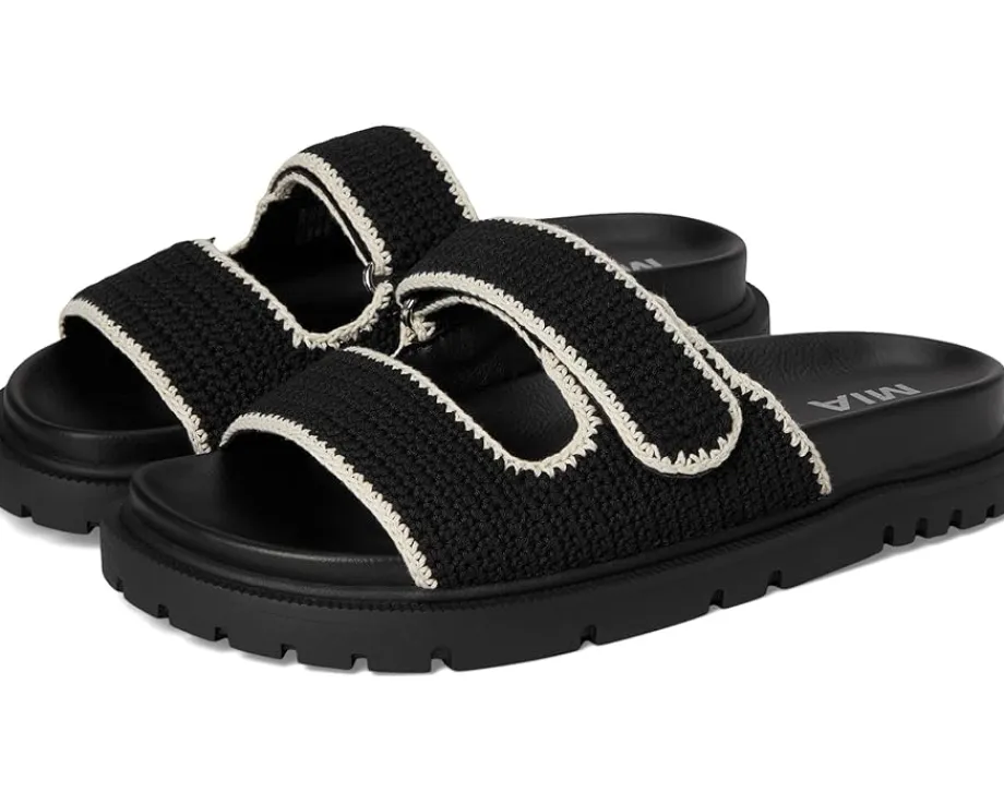 - Slip into ease and trend with MIA™ GABRI. This playful sandal is crafted with a chic crochet faux leather upper, double hook-and-loop straps, faux leather lining, and our MIA™ signature faux leather footbed for maximum comfort. The open round-toe silhouette with easy slip-on style allows quick on/off.