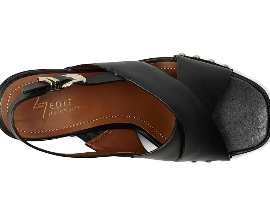 - Modern muse and metallic touch in the Naturalizer® 27 Edit Kirsten. These statement-making slingback sandals blend edgy elegance and all-day ease, thanks to gleaming metallic studs and a premium leather upper that turns heads wherever you go. Feel secure with an adjustable buckle slingback closure and walk tall on a sturdy block heel that’s both stylish and supportive. The open-toe silhouette adds breezy charm, while REZORB™ responsive cushioning and Contour+ Comfort technology team up for sneaker-level shock absorption and impact protection-yes, even in heels. The partially bio-based PU lining and faux leather insole offer eco-conscious polish, and the durable rubber outsole ensures confident strides.