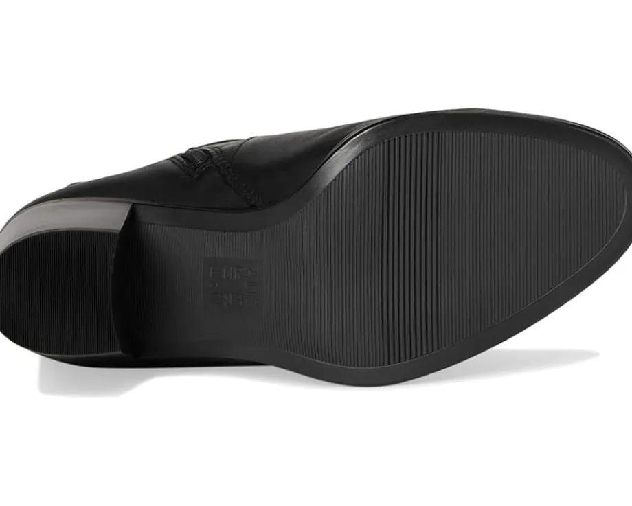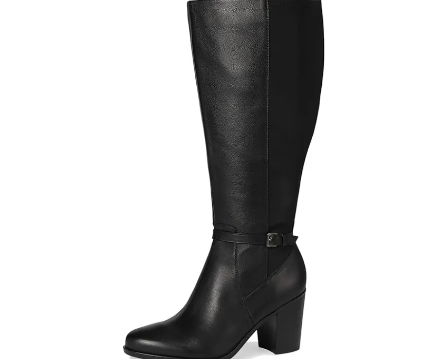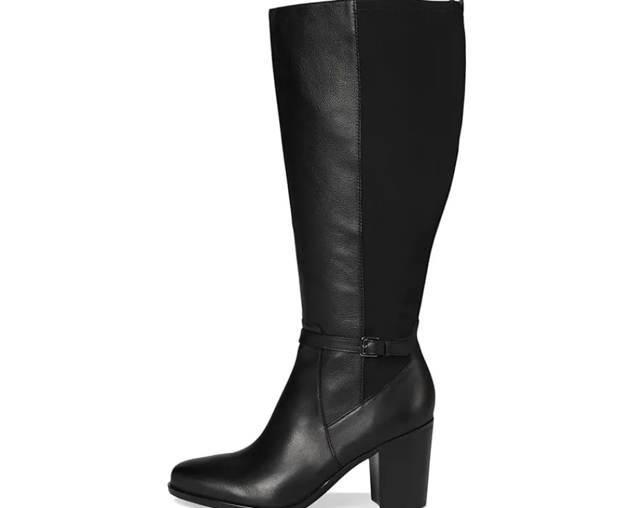 - Sleek heeled knee high boot with goring panel and decorative buckle.