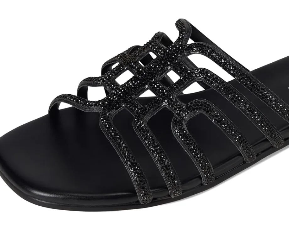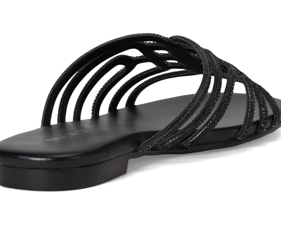 - Complete your look in the Nine West® Timy dress flats. They feature a modern square toe shape, strappy silhouette, and embellishments on the straps. These slide sandals are made of a polyurethane upper, cushioned footbed, and polyurethane lining. These flat sandals are anything but boring and sure to impress.