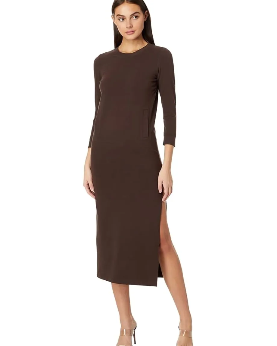 - Look graceful wearing the Norma Kamali® 3/4 Sleeve Tailored Terry Gown. Perfect for outings, this mid-calf length dress features crew neckline, front hand pockets, and straight hem with one side slit for a flattering silhouette.