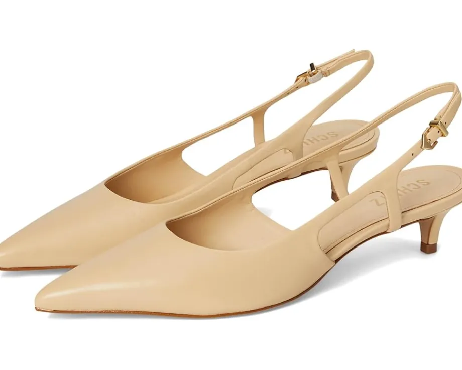 - Unleash the sophistication within wearing the Schutz® Boris Kitten. Crafted from leather upper, lining, and EVA insole, this pair of sandals features pointed toe, kitten heels, mid-top silhouette, sling back strap with buckle closure, and brand detailing on the footbed.