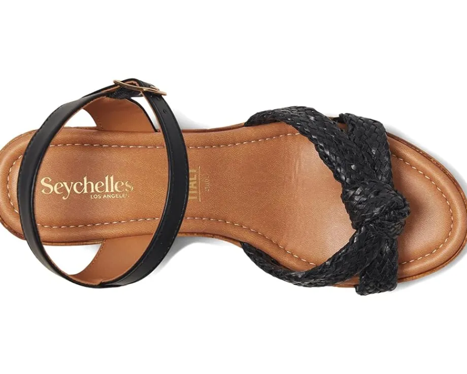 - With the retro knotted woven polyurethane upper, padded faux leather insole, adjustable ankle strap, and lightweight cork plastic outsole, the Seychelles® Musical V sandals are the perfect combination of fabulous and functional. These heeled sandals are perfect to pair with different outfits and styles.