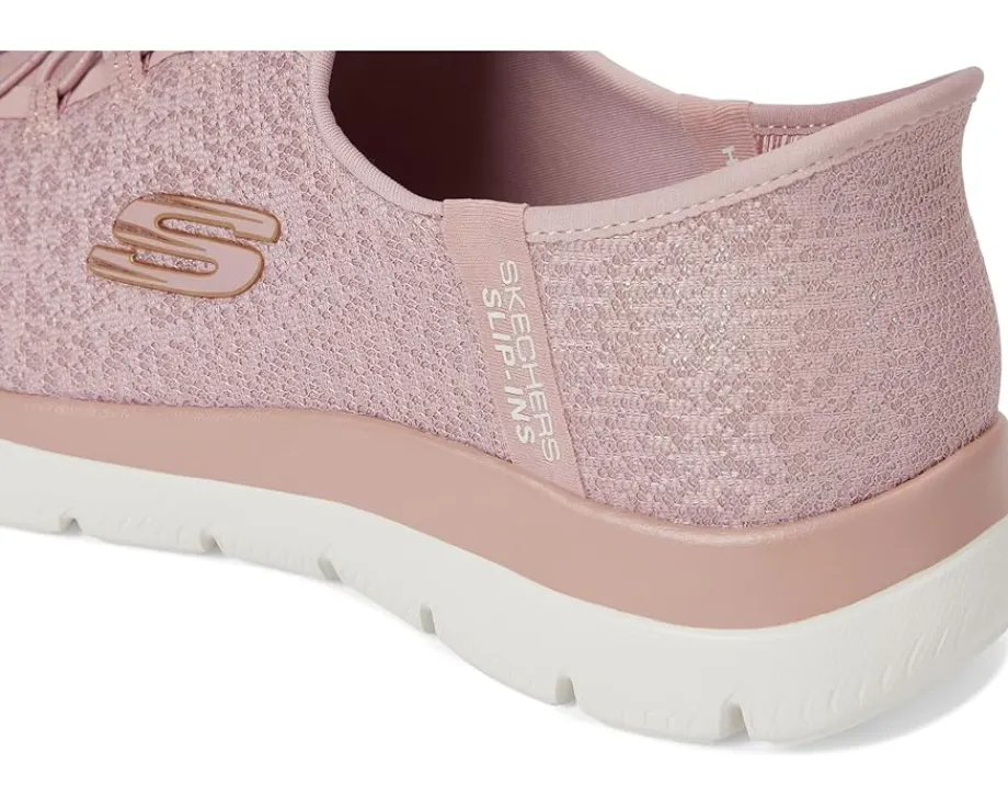 - Add some shimmer to every step wearing the SKECHERS® Summits-Lunar Glow Hands Free Slip-Ins shoes. Designed with an exclusive Heel Pillow™ that holds your foot securely in place, these slip-on shoes feature an iridescent mesh upper with fixed stretch laces and a cushioned Skechers Air-Cooled Memory Foam® comfort insole. Their lightweight, flexible, and shock-absorbing midsole offers all-day comfort and support. Machine washable, these lace-up sneakers are styled with a Skechers® logo detail, Skechers Hands Free Slip-ins® design for an easy fit, and No Tie Fit™ laces that never come untied.